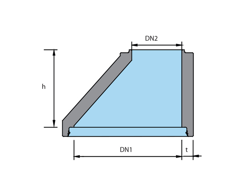 | Varenummer | DN1 (mm) | DN2 (mm) | Mannhull | Høyde h (mm) | Vekt (Kg) | Tykkelse t (mm) | Pris eks. mva |