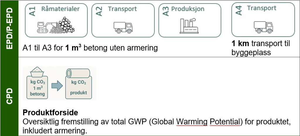 Beregningen omfatter livsløpet fra råvareuttak til ferdig produsert betong ved fabrikkport (A1–A3). Transport til byggeplass (A4) inngår ikke i beregningen for å definere klassene til et produkt.