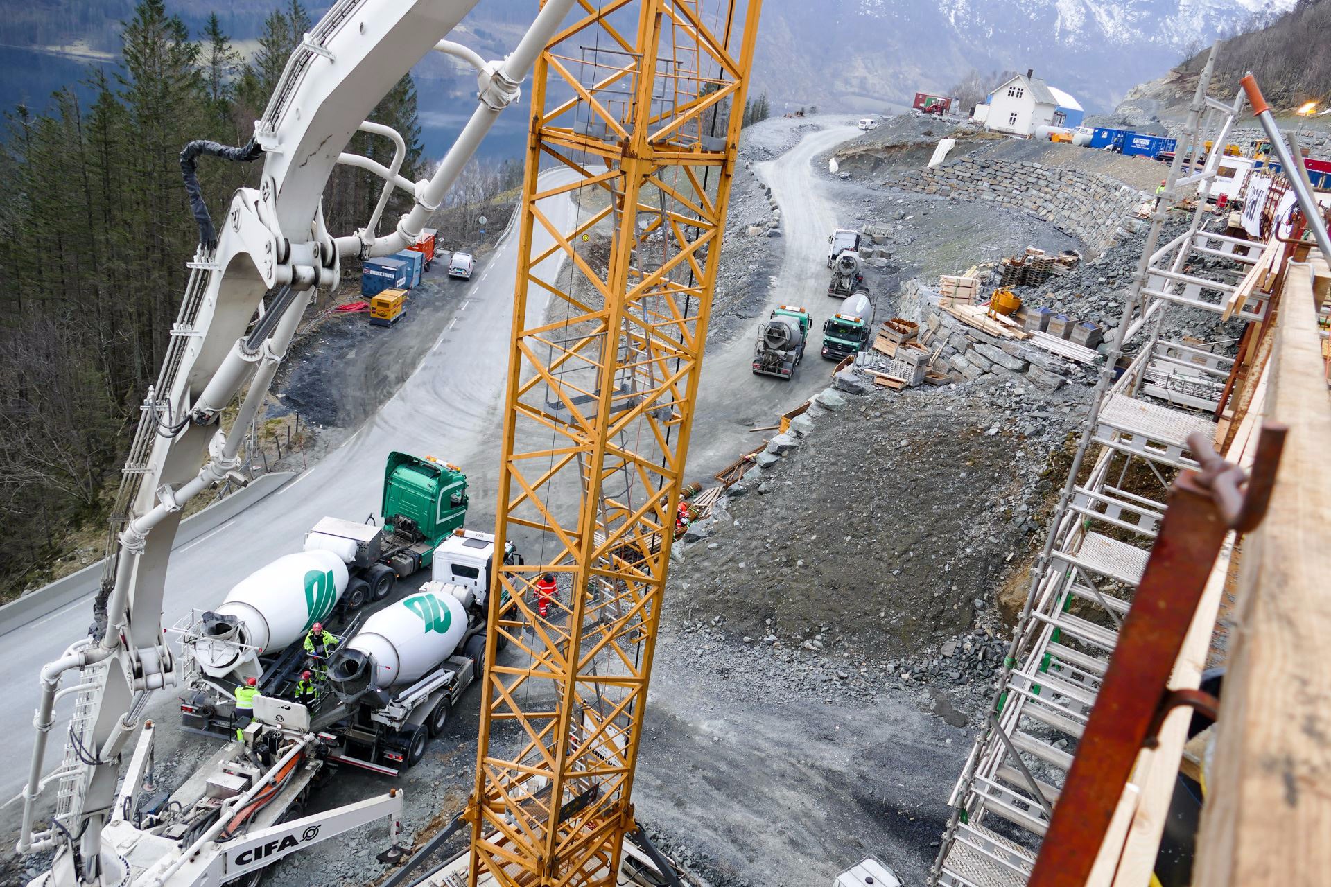 - I tillegg til betongbilene våre i Ølensvåg, satte vi inn tre biler fra avdelingen vår i Gismarvik. Vi fikk også god hjelp fra Sandnes Betong, der vi er deleiere. De var med på hele støypen og stilte med betongpumpe til jobben. Den måtte brukes midtveis i støypen, da betongen skulle pumpes opp fra betongbilene på bakken ved nåværende E 134, og opp til brua ca 17 meter i høyden over veien, forteller Berge.