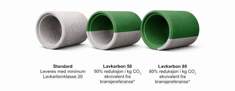 Vi tilbyr alle standardprodukter i Lavkarbonklasse 50 og 80. Disse klassene forutsetter bruk av sement med karbonfangst (CCS eller CCU) og er utviklet for prosjekter med høye miljøambisjoner.